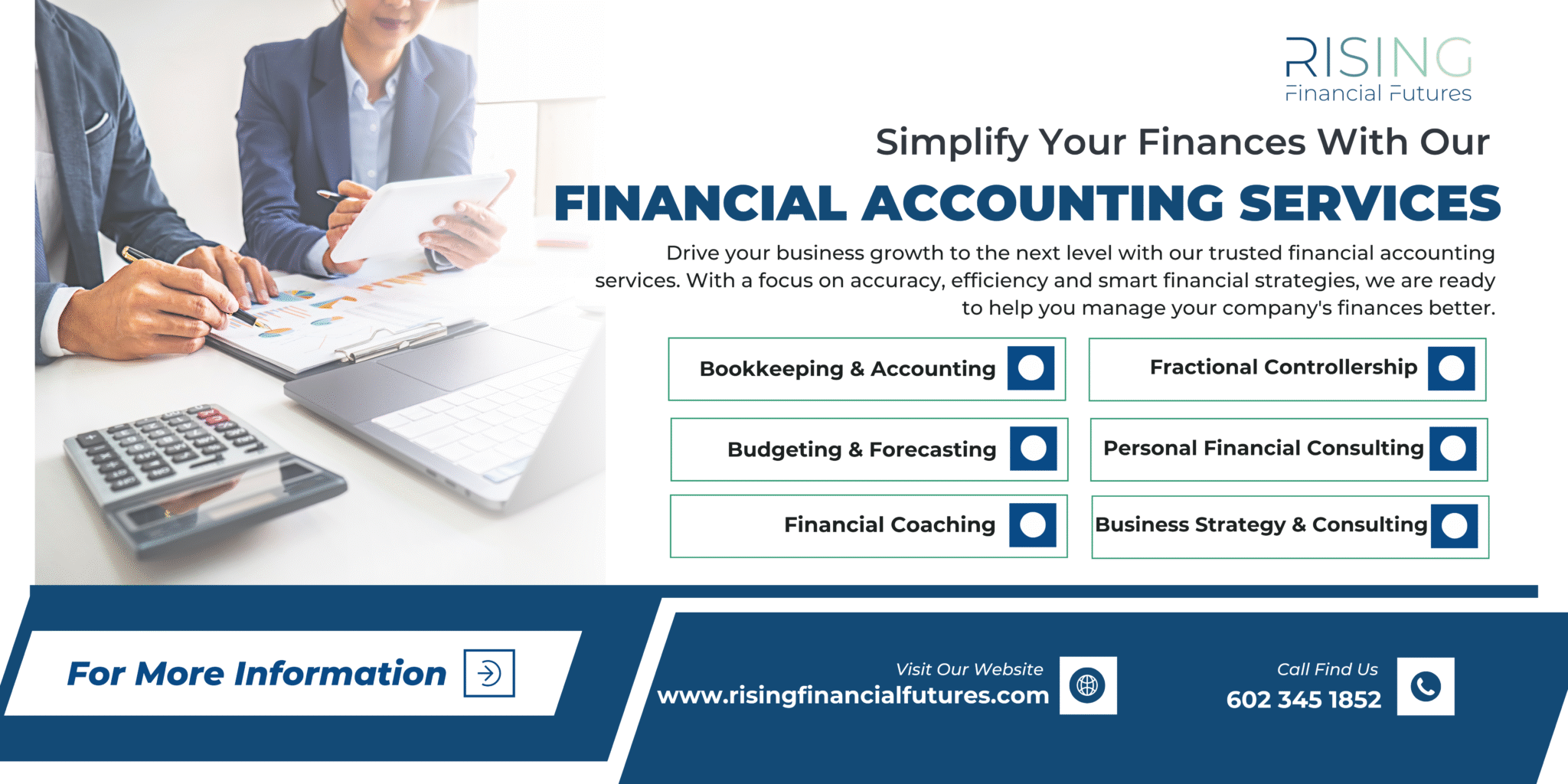 At Rising Financial Futures, we offer outsourced accounting and bookkeeping services, personal financial consulting, and virtual fractional controllership services — all designed to simplify your day-to-day and help you plan for the future. Our mission is simple: give you clarity, strategy, and peace of mind through custom financial solutions built for real life.